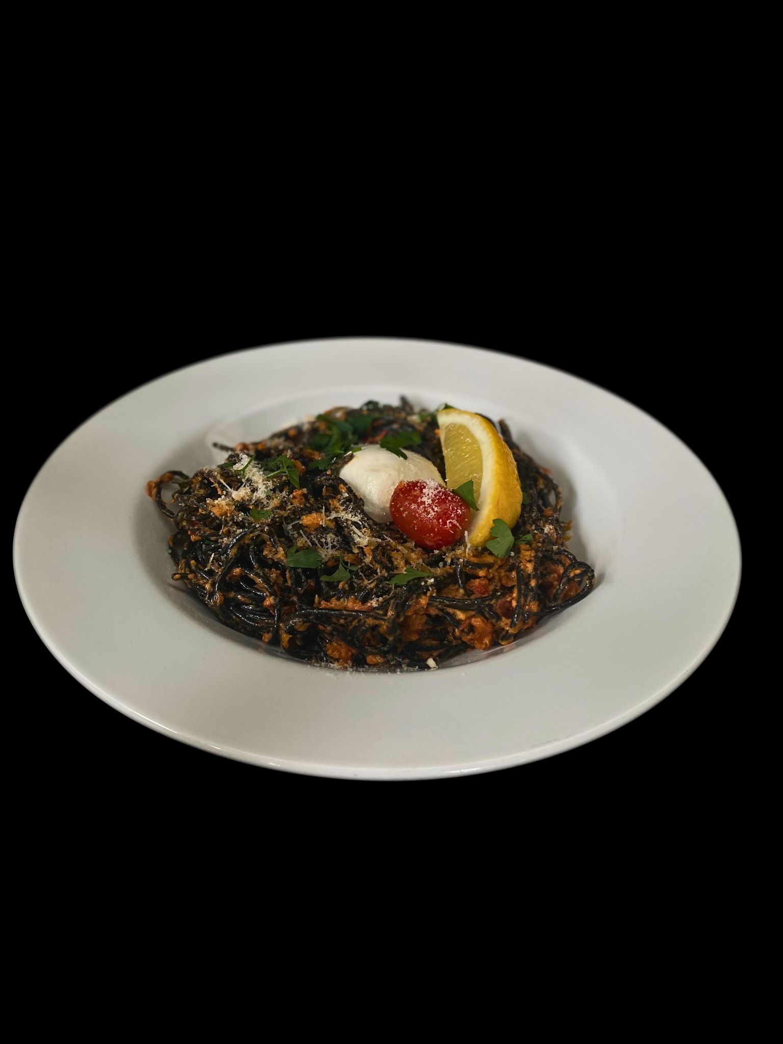 black linguine, sundried tomatoes, garlic, and roasted cherry tomatoes in a creamy sauce with burrata and parmesan