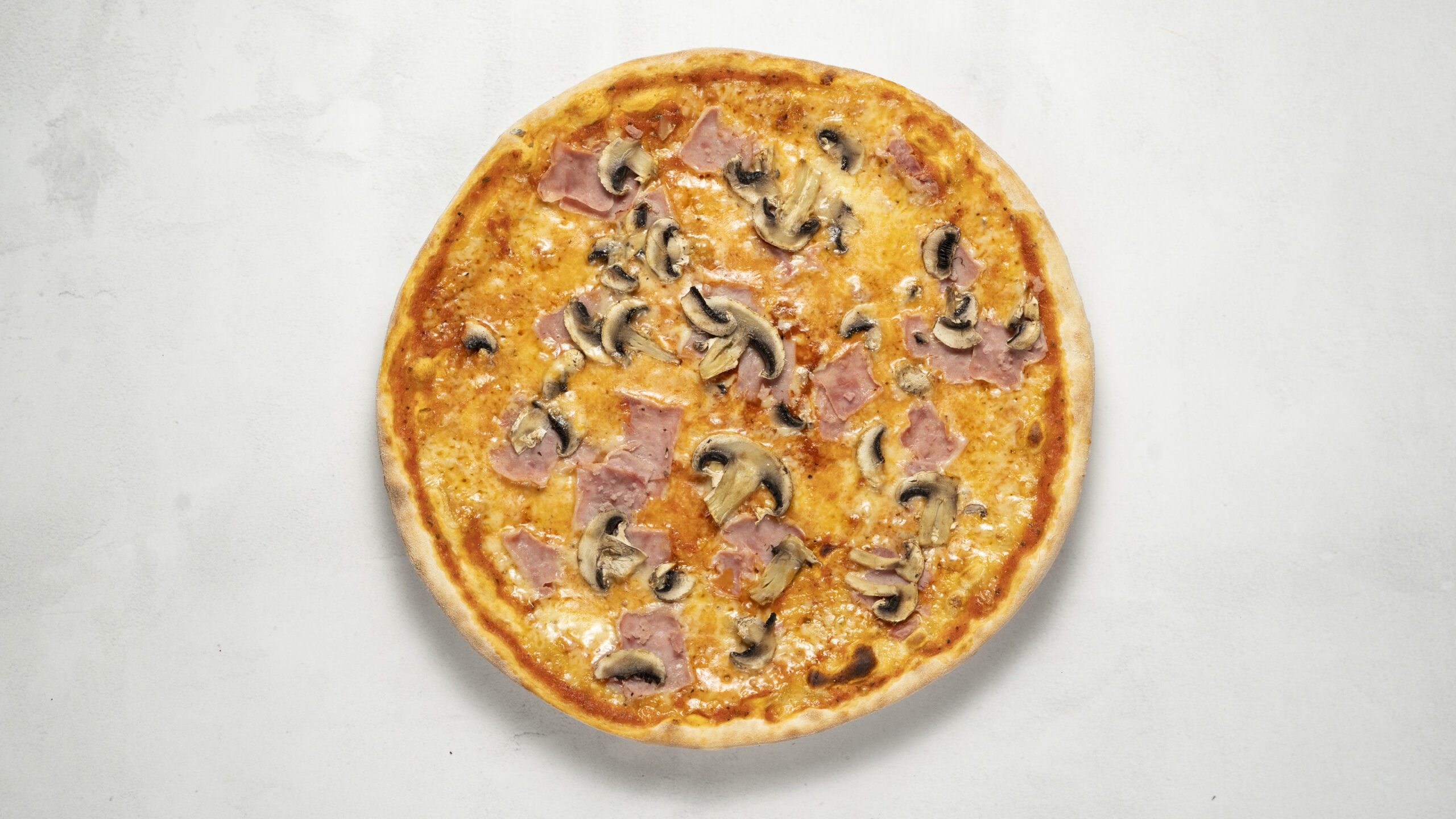 Skinka, champinjoner, räkor, purjolök, paprika, ost ovanpå