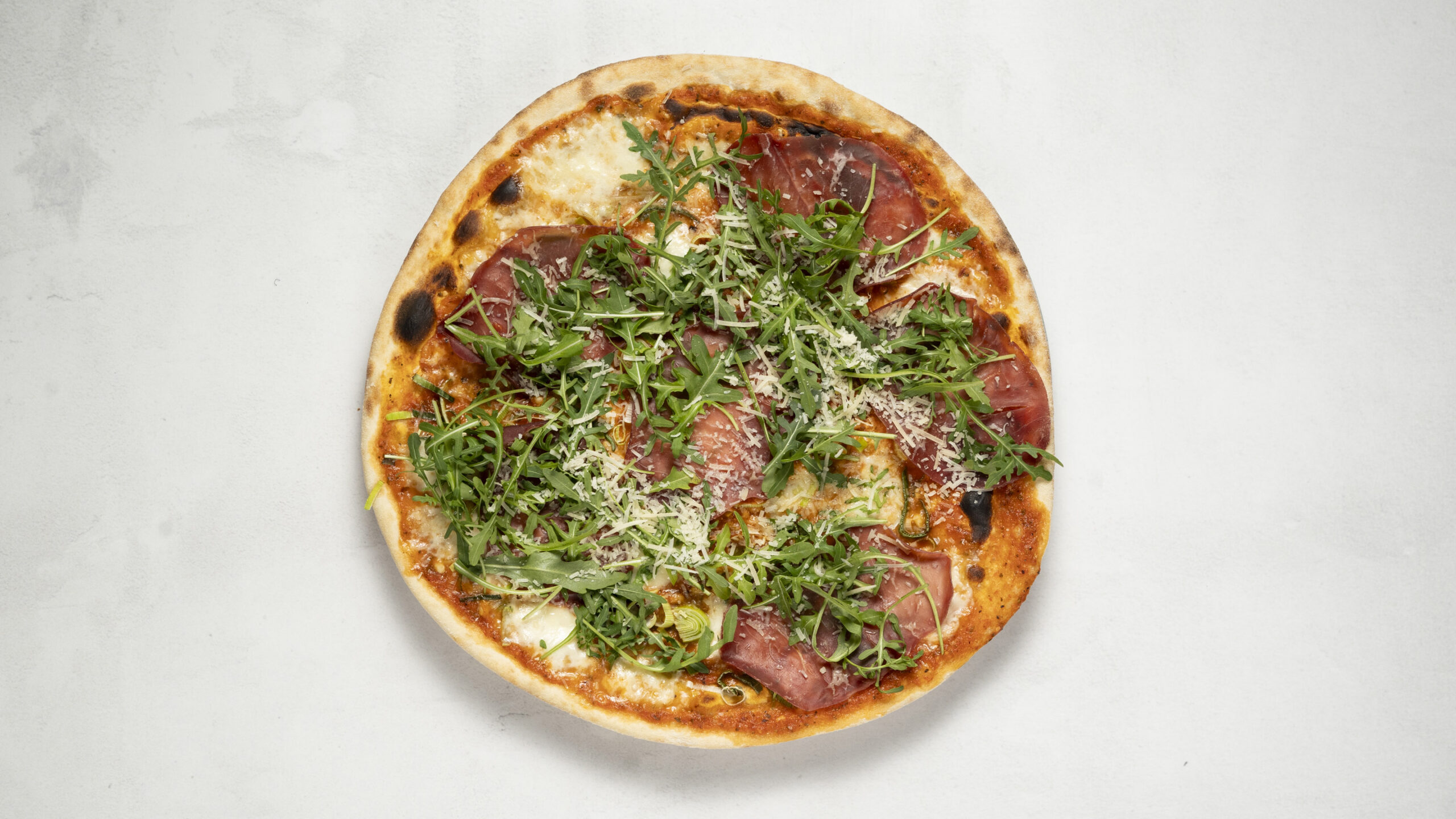 Mozzarella, parmesanost, bresaola, purjolök, pinjenötter, rucola
