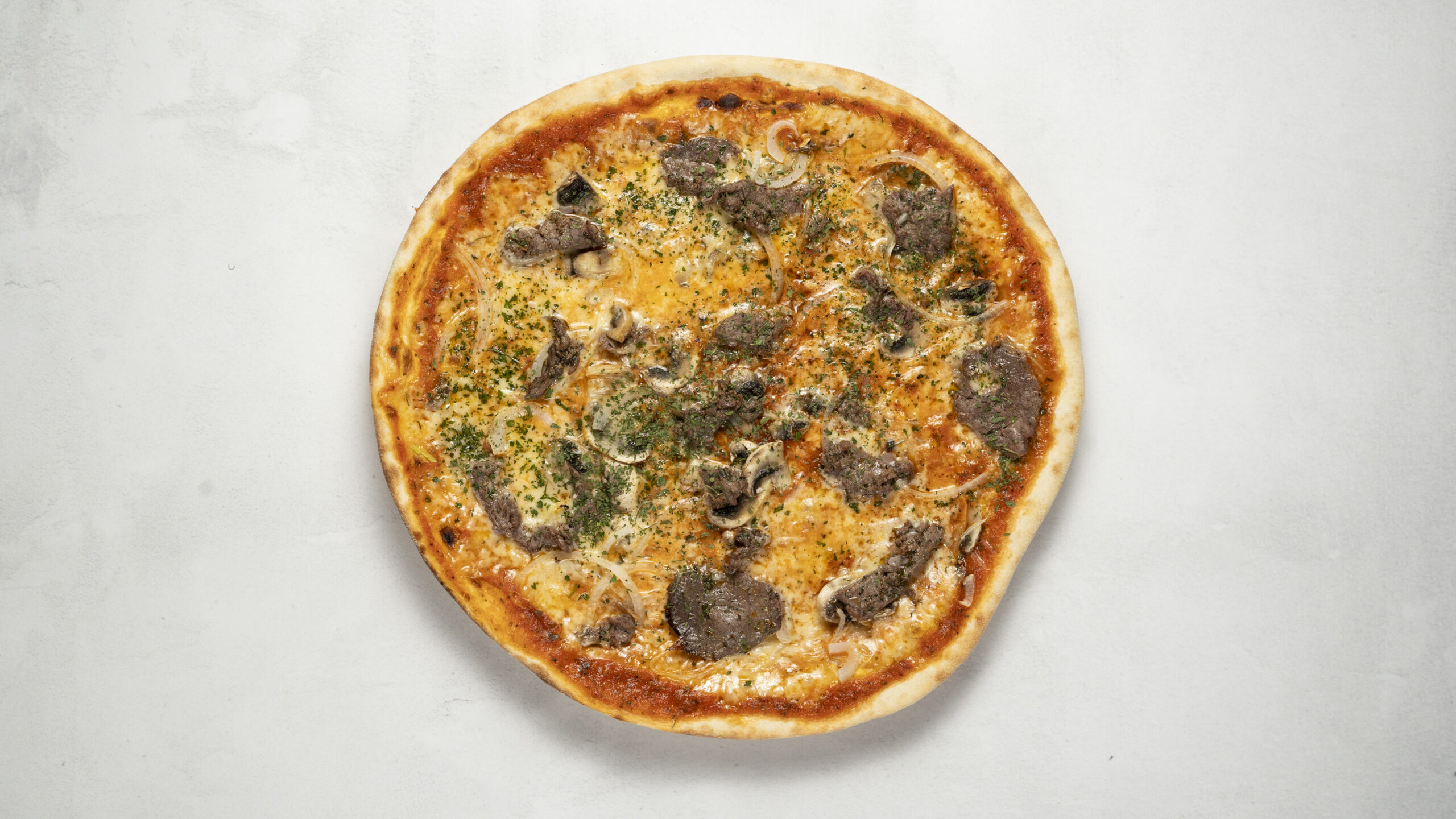 (Mammas pizza) Ost, aubergine, köttfärs, tomater, fårost, rucola